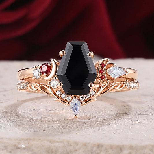 Coffin Cut Onyx Leaf And Moon Inspired Bridal Ring Set - Khaleesi