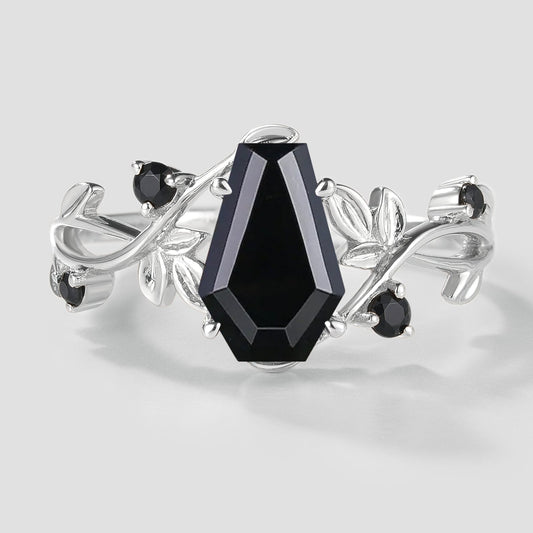 Coffin Cut Black Onyx Leaf Engagement Ring