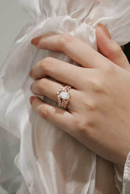 Emerald Cut Nature Inspired Leaf Moissanite Engagement Ring Set 2pcs