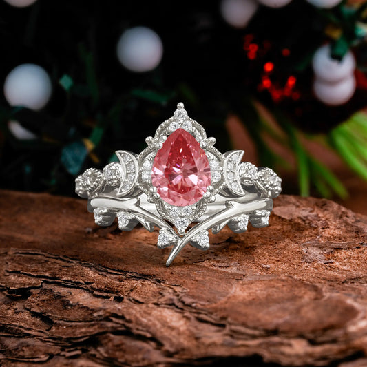Unique Pear Shaped Engagement Ring Set Pink Lab Diamond Cluster Wedding Band